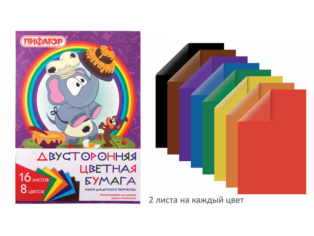 Набор офсетной двусторонней цветной бумаги плотностью 65 г/м2 включает 16 листов формата А4 (200х275 мм) в 8-ми разнообразных и насыщенных однородных цветах. Листы скреплены скобами, легко режутся и сгибаются.