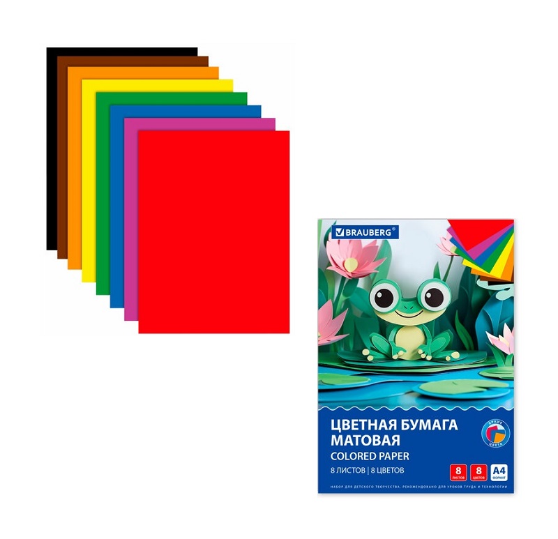 Набор офсетной односторонней цветной бумаги плотностью 65 г/м2 включает 8 листов формата А4 (200х283 мм) в 8 разнообразных и насыщенных однородных цветах. Листы скреплены скобами, легко режутся и сгибаются.
