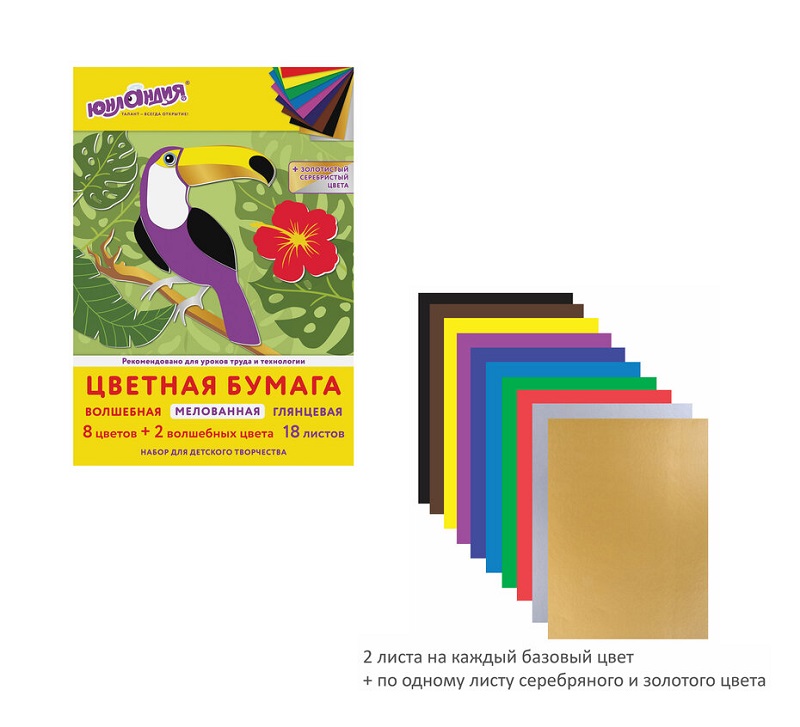 Цветная бумага незаменима при создании аппликаций, поделок и открыток. Прокрас бумаги: с 2-х сторон. Производитель: Россия.17.20 руб. 34.39 руб. - кс_Цветная бумага арт. 113535 А4 мелованная ВОЛШЕБНАЯ 18л. 10цв. на скобе Юнландия 200х280мм Тукан×кс_Цветная бумага арт. 113535 А4 мелованная ВОЛШЕБНАЯ 18л. 10цв. на скобе Юнландия 200х280мм ТуканЦветная бумага предназначена для творчества и хобби и может использоваться с трехлетнего возраста для развития моторики и фантазии ребенка. Набор мелованной (глянцевой) односторонней цветной бумаги плотностью 80 г/м2 включает 18 листов формата А4 (200х280 мм) в 10-ти разнообразных и насыщенных однородных цветах с содержанием золотого и серебряного цвета. Листы скреплены скобами, легко режутся и сгибаются. Цветная бумага – это самый доступный и универсальный материал для детского творчества. Она незаменима при создании аппликаций, поделок и открыток.
