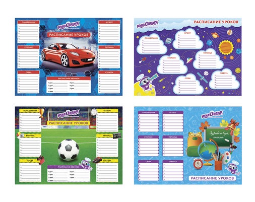 - кс_Расписание уроков и звонков арт. 129782 А4, ЮНЛАНДИЯ, для мальчиков, ассорти (4 вида)×кс_Расписание уроков и звонков арт. 129782 А4, ЮНЛАНДИЯ, для мальчиков, ассорти (4 вида)Для каждого ребенка имеет особое значение распорядок дня, а расписание уроков ЮНЛАНДИЯ поможет рационально организовать время и подготовить все необходимое для следующих занятий. Расписание уроков разработано специально для детей школьного возраста. Оно идеально подходит для планирования и подготовки заданий в домашних условиях. Поставляется в четырех вариантах дизайна (без возможности выбора). Расписание выполнено из высококачественной импортной мелованной бумаги формата А4. Для удобства изображена шестидневная учебная неделя с 7 уроками на каждый день.