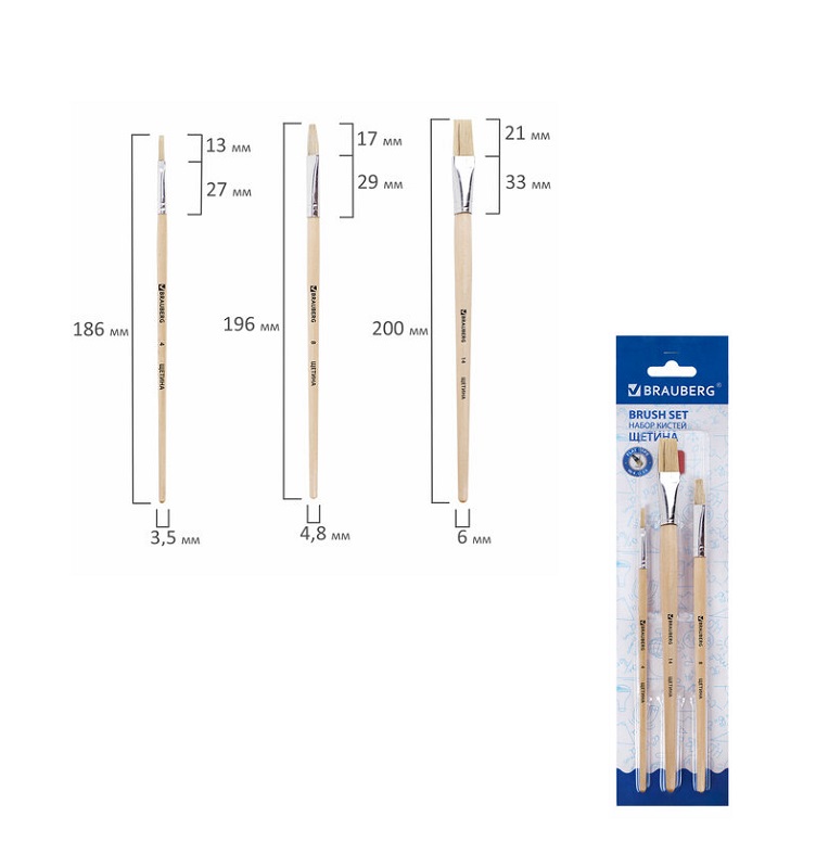 кс_Кисти арт. 200223 BRAUBERG, набор 3 шт. (щетина, плоские № 4, 8, 14), блистерКол-во кистей в наборе: 3 шт.
