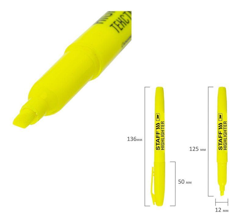 Текстовыделитель облегчает работу с документацией и запоминание основных фрагментов. Обладает круглой формой корпуса диаметром 12 мм. Корпус тектовыделителя оснащен удобной зоной захвата. Скошенный наконечник имеет толщину линии письма от 1 до 3 мм, что обеспечивает удобство при работе с текстом, напечатанным мелким шрифтом, или таблицами. Текстовыделитель обладает экономным расходом чернил. Светоустойчивые чернила на водной основе не выцветают даже на открытом солнце и не размазываются в процессе использования. Изделие не перезаправляется. Корпус с колпачком соответствует цвету чернил.