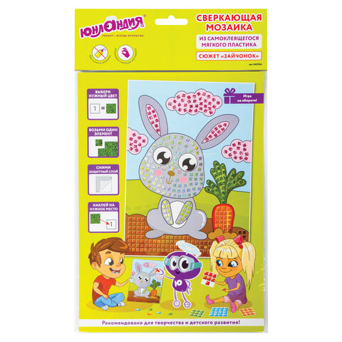 Сверкающая мозаика из мягкого пластика EVA ЮНЛАНДИЯ "Зайчонок" - это весёлый и занимательный способ развития мелкой моторики, аккуратности и цветового восприятия ребёнка. Все элементы в составе самоклеящиеся, для работы не требуются ножницы и клей.