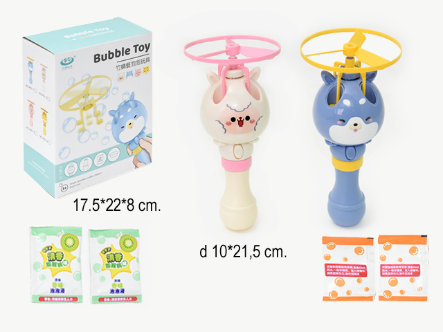 В набор входит порошок для мыльного раствора, емкость для его разведения, бутылочка и генератор с пропеллером в виде овечки или собачки.