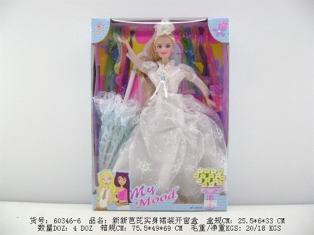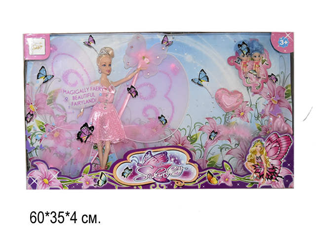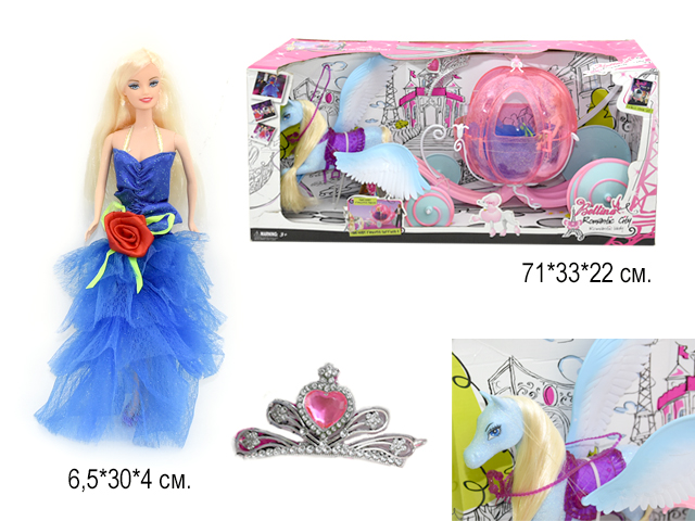 Лошадь с крыльями покрыта мелкими блестками и переливается при разном освещении. Грива и хваст длинные и шелковистые, их можно причесывать и украшать. Седло и упряжка снимаются. Форма кареты напоминает другоценный камень. Кукла одета в арядное платье.