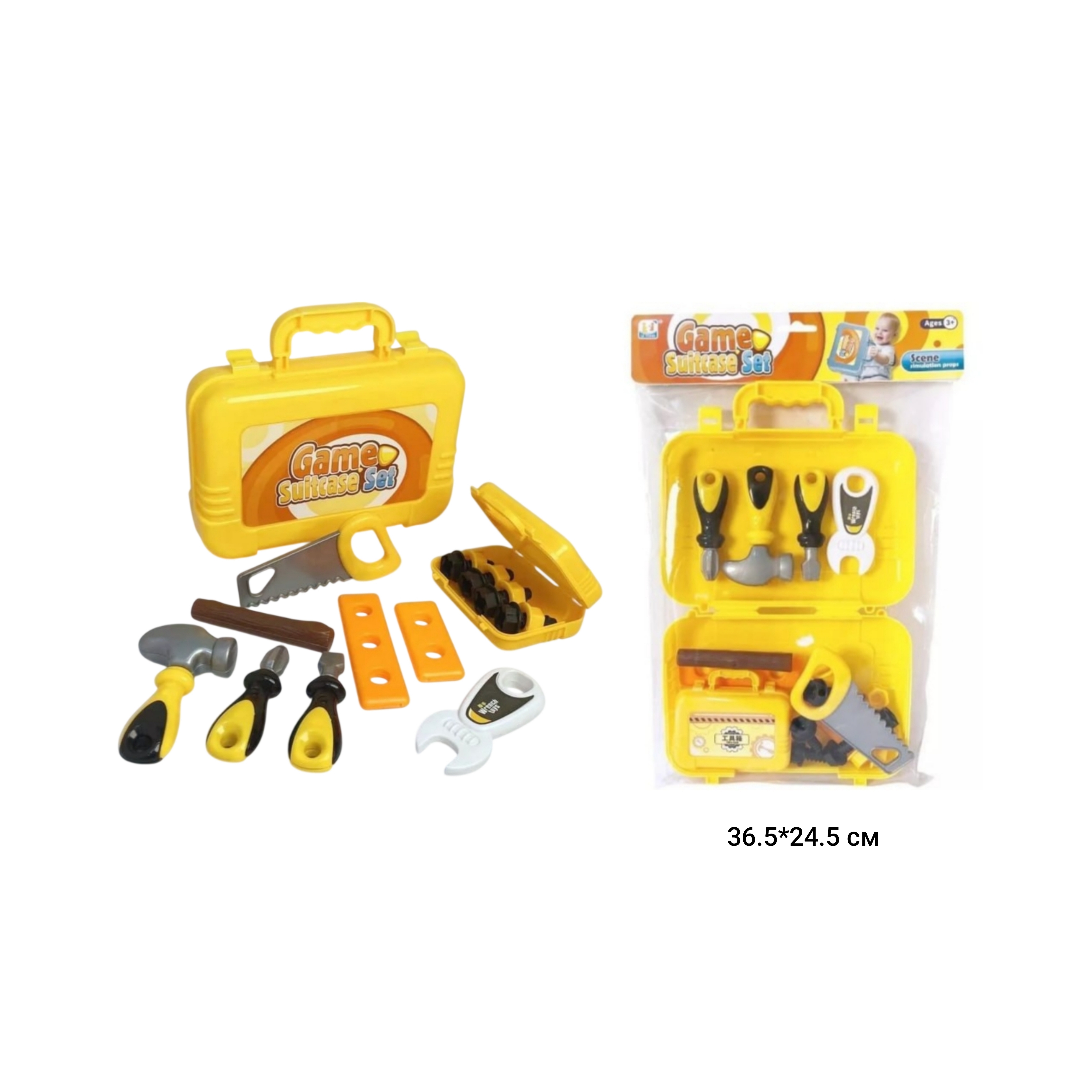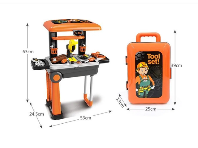 Набор представляет собой рабочее место настоящего слесаря, тут есть все необходимые инструменты и удобные полочки: отвертка, пила болгарка, пила ручная, гайки, шурупы, крепежные элементы, молоток, гаечный ключ. Весь набор компактно складнывается в удобный чемодан с выдвжной ручкой и на колесиках, поэтому "рабочее место" можно взять с собой куда угодно и мастерить при каждом удобном случае.